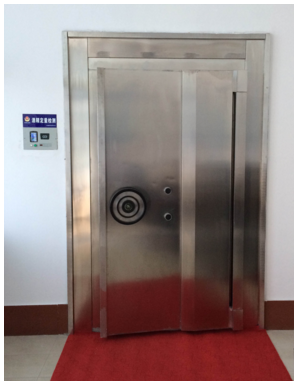 库门的基本构件包括门体、门框、前后罩壳总成、铰链总成、门栓开合机构、重锁装置、组合锁等。库门具有紧急备用开启方式,通过开启两把进口洛加达叶片锁具,长时间停电也可紧急开启库门,库门的门栓为全幅活动板栓,另一侧为固定全幅板栓,库门关闭时,即使铰链被破坏,也能保证门框与之紧密相扣。运行稳定可靠。库门主轴材料选用45号优质碳素钢,经调质处理,硬度达到HRC28-32,开启轻便灵活,开启力<147N。