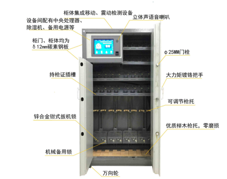 智能枪柜依托于公安内网,具有后台联网功能,软件采用B/S,C/S混合模式,支持网上用枪申请、网上审批、二级审批、短信审批、警用通终端APP管理,短信报警、远程封柜等管理功能。其他功能可根据客户需求灵活定制。